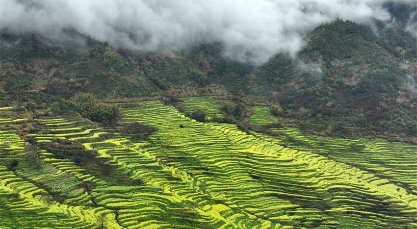 Paisaje de campos de colza en flor en la aldea de Xingfu, en Anhui, este de China