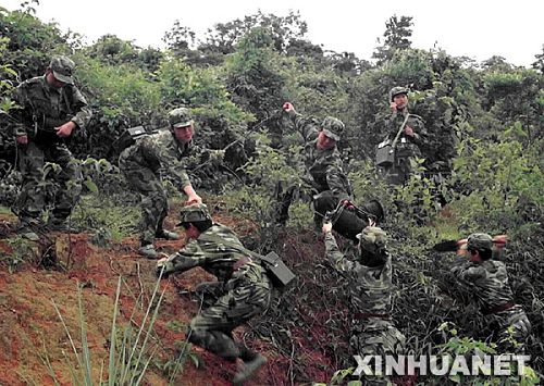 Una escuadra de soldados mujeres de una compañía de comunicaciones acantonada en las montañas Wuzhishan, isla de Hainan, tendiendo cables eléctricos al aire libre para establecer una estación de enlace.