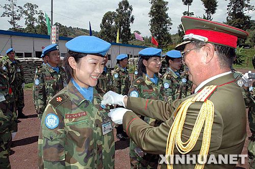 El agregado militar Jiao Peizhong (derecha), de la Embajada china en el Gongo (Kinshasa), condecorando en Bukavu a Sun Jie (izquierda), enfermera de 22 años del equipo médico chino de la unidad de paz de las Naciones Unidas en ese país, el 21 de marzo de 2007.