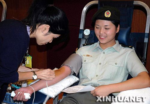 Una soldado de la unidad del EPL acantonada en Macao en la donación de sangre gratuita organizada por el gobierno de la región administrativa especial en el Centro de Turismo de Macao, el 29 de septiembre de 2006.