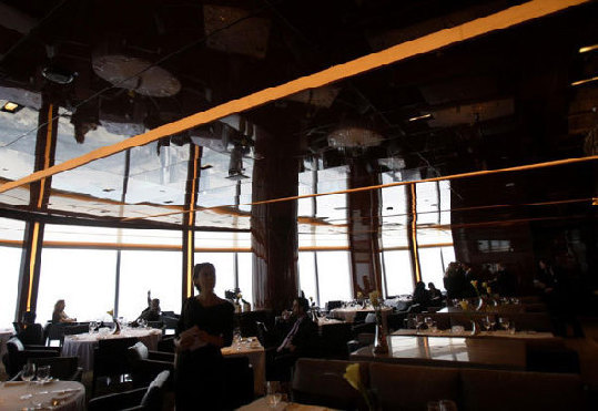 El lujoso lounge del At.mosphere va más allá de los salones convencionales y sirve como una escala ideal para un almuerzo ligero o incluso un té de la tarde. A la hora de la cena, la atmósfera cambia con el agregado de las magníficas vistas nocturnas de la ciudad.Platos a la parrilla contemporáneos, que sirven lo que el jefe ejecutivo de Emaar Hospitality llama "cocina europea ecléctica", cuestan un promedio de 340 dirhams (93 dólares). Mientras los aperitivos le costarán otros 50 dólarse por persona. El panorama que se contempla desde At.mosphere al mediodía muestra el pasado y el presente de Dubai: de un lado, sus ambiciosos proyectos ‘Isla Artificial’ y ‘El Mundo’ se encuentran inconclusos en medio de las olas azules, mientras que en el otro, las obras sin acabar jalonan las extensiones de arena. |