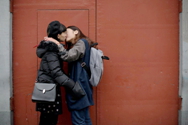 Ma Yu Yu (izq.) y Elsie Liao se besan frente a una oficina del registro de matrimonio de Beijing, después que les fuera denegada su petición para formalizar su relación ante la ley, este 25 de febrero.