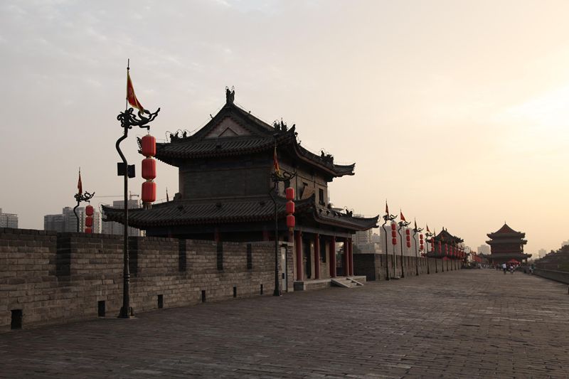 La muralla de Xi'an se construyó entre los años 1374 y 1378, durante la dinastía Ming. Es la mejor conservada de todas las que defendían las ciudades de China. Tiene una longitud de 13,74 kilómetros, con forma rectangular rodeando la zona antigua de la ciudad. Su altura es de 12 metros y el ancho varía entre los 15 y los 18 metros. Alrededor de la muralla se encuentran diversas construcciones de defensa, tales como torres de vigilancia y de flechazos, y un profundo foso con el fin de proteger la ciudad de los posibles ataques.