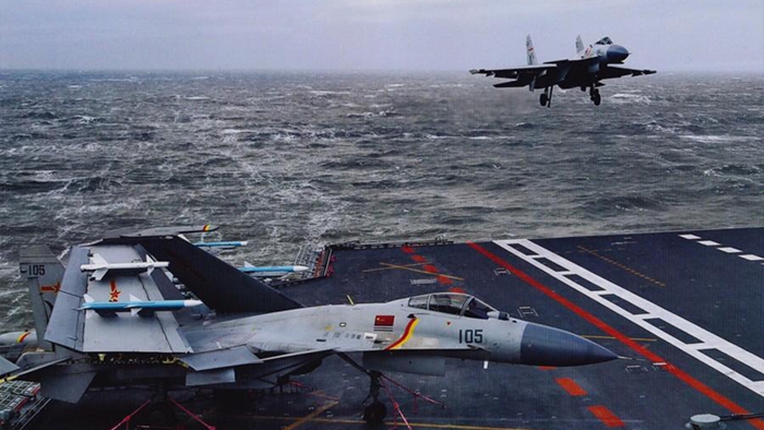 Cazas J-15 en un entrenamiento en un portaaviones chino