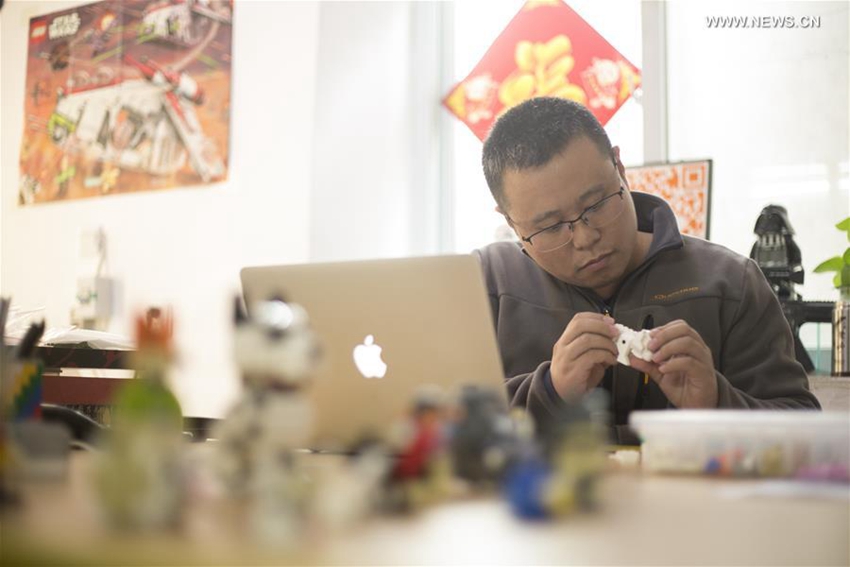 | Huang Haitao diseña un producto original de ladrillos Lego en el estudio "Pinle Culture" en Beijing, capital de China, el 14 de noviembre de 2016. Liu Fangzhou, Pan Xiaolei y Huang Haitao son fans de Lego. Se reúnen y diseñan productos originales utilizando bloques de Lego con la esperanza de conocer personas que disfrutan de los mismos intereses. Han creado decenas de estatuas que se mostraron en varias ocasiones. Les gustaría cooperar con las organizaciones de educación en el futuro y traer la diversión de los ladrillos de plástico a los niños. |