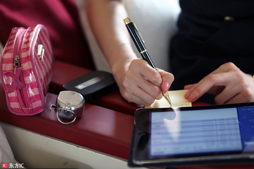 Liu Miaomiao escribe las necesidades dietéticas especiales de los pasajeros.