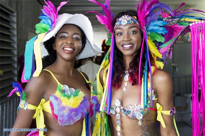 Juerguistas posan durante la ceremonia oficial del lanzamiento del 50 aniversario del Carnaval Caribeño de Toronto, en la plaza Nathan Philips en Toronto, Canadá, el 11 de julio de 2017. De acuerdo con información de la prensa local, la 50 edición del Carnaval Caribeño de Toronto que comenzó el martes, celebra la historia y la cultura del Caribe.