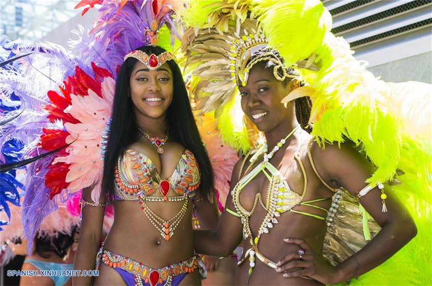 Juerguistas posan durante la ceremonia oficial del lanzamiento del 50 aniversario del Carnaval Caribeño de Toronto, en la plaza Nathan Philips en Toronto, Canadá, el 11 de julio de 2017. De acuerdo con información de la prensa local, la 50 edición del Carnaval Caribeño de Toronto que comenzó el martes, celebra la historia y la cultura del Caribe.
