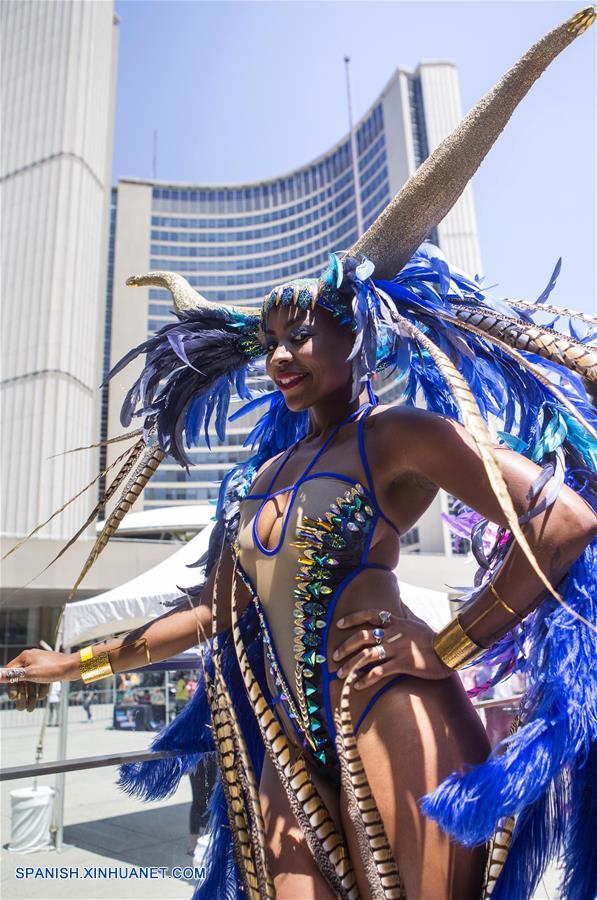 Una juerguista posa durante la ceremonia oficial del lanzamiento del 50 aniversario del Carnaval Caribeño de Toronto, en la plaza Nathan Philips en Toronto, Canadá, el 11 de julio de 2017. De acuerdo con información de la prensa local, la 50 edición del Carnaval Caribeño de Toronto que comenzó el martes, celebra la historia y la cultura del Caribe.