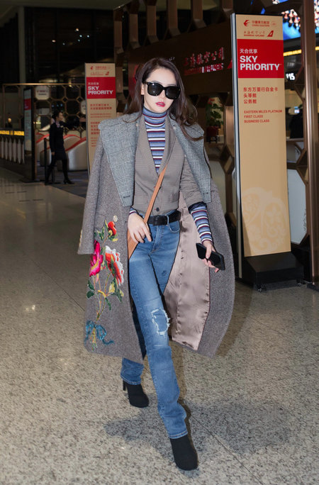 La actriz Qi Wei con un abrigo de flores el 23 de noviembre de 2017.