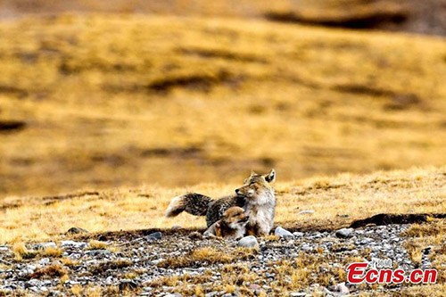 Dos zorros tibetanos juegan en el campo de Yangkang, condado de Tianjun, provincia de Qinghai, en el noroeste de China. El animal es una especie de zorro endémica de la alta meseta tibetana.