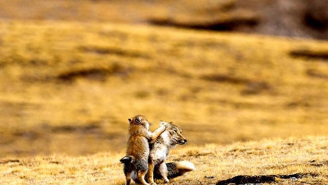 Dos zorros tibetanos juegan en el campo de Yangkang, condado de Tianjun, provincia de Qinghai, en el noroeste de China. El animal es una especie de zorro endémica de la alta meseta tibetana.