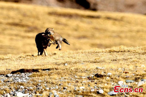 Dos zorros tibetanos juegan en el campo de Yangkang, condado de Tianjun, provincia de Qinghai, en el noroeste de China. El animal es una especie de zorro endémica de la alta meseta tibetana.