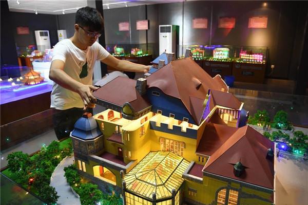 Un empleado presenta una maqueta de edificios antiguos durante una exposición en Qingdao, en la provincia de Shandong, en el este de China, el 28 de julio de 2019. Una exposición sobre las maquetas de los edificios antiguos en Qingdao se lleva a cabo en el Centro de Vela Internacional de Qingdao, durante la cual 60 maquetas son exhibidas para mostrar la historia y cultura de la ciudad costera.