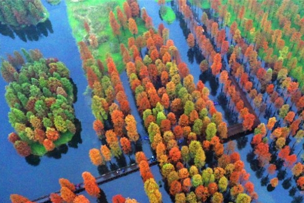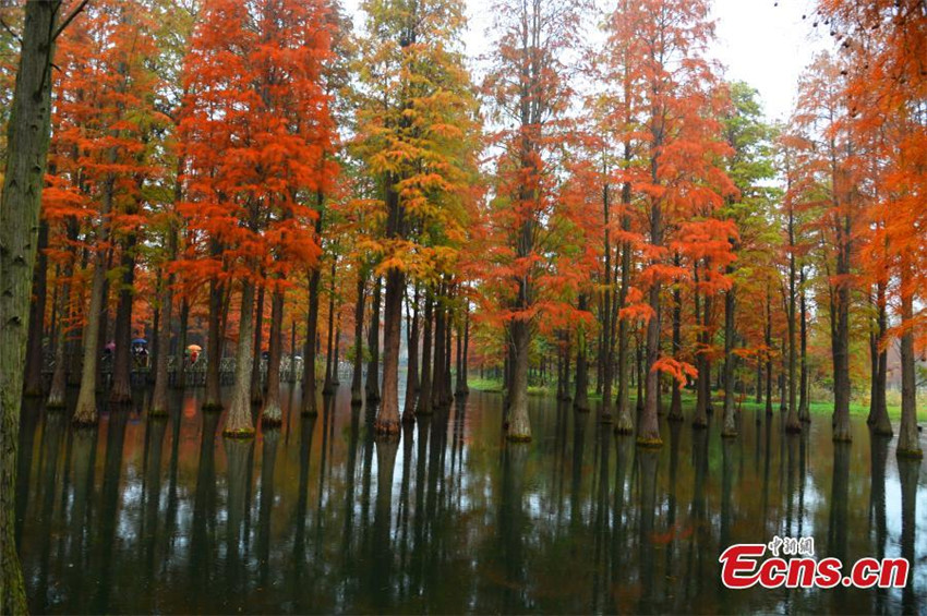 Fotografía del 30 de noviembre de 2019 en la que se retratan decenas de cipreses de estanque en un parque en el distrito de Qingpu, Shanghai.