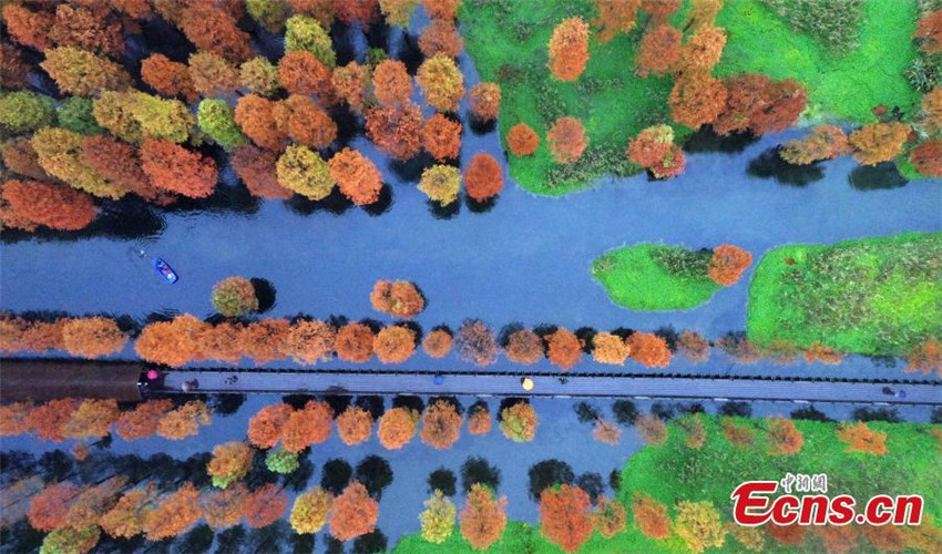 Fotografía del 30 de noviembre de 2019 en la que se retratan decenas de cipreses de estanque en un parque en el distrito de Qingpu, Shanghai.