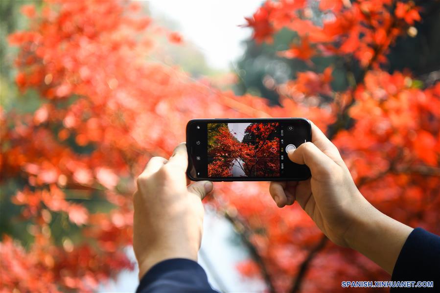 Un turista toma fotografías de las hojas de arce en la montaña Yuelu en Changsha, provincia de Hunan, en el centro de China, el 7 de diciembre de 2019.