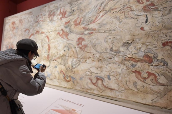 Imagen del 12 de diciembre de 2019 de una visitante tomando fotografías de una obra en el Museo de Shanxi en Taiyuan, capital de la provincia de Shanxi, en el norte de China. En la exposición se exhiben murales de tres tumbas de las dinastías del norte (386-581) en Shanxi.