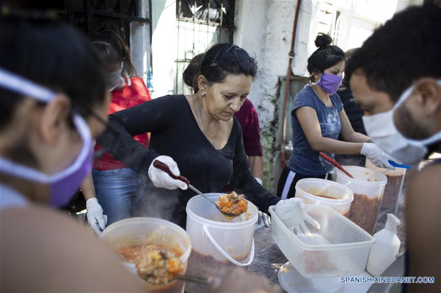 Voluntarias sirven comida en un comedor popular en la localidad de Rafael Castillo, partido de La Matanza, a 35 kilómetros de la ciudad de Buenos Aires, capital de Argentina, el 2 de abril de 2020. Las Fuerzas Armadas de Argentina se han desplegado en puntos sensibles del territorio para apoyar en la batalla contra la enfermedad del nuevo coronavirus (COVID-19), cuyos casos confirmados suman hasta ahora 1.133 en todo el país.