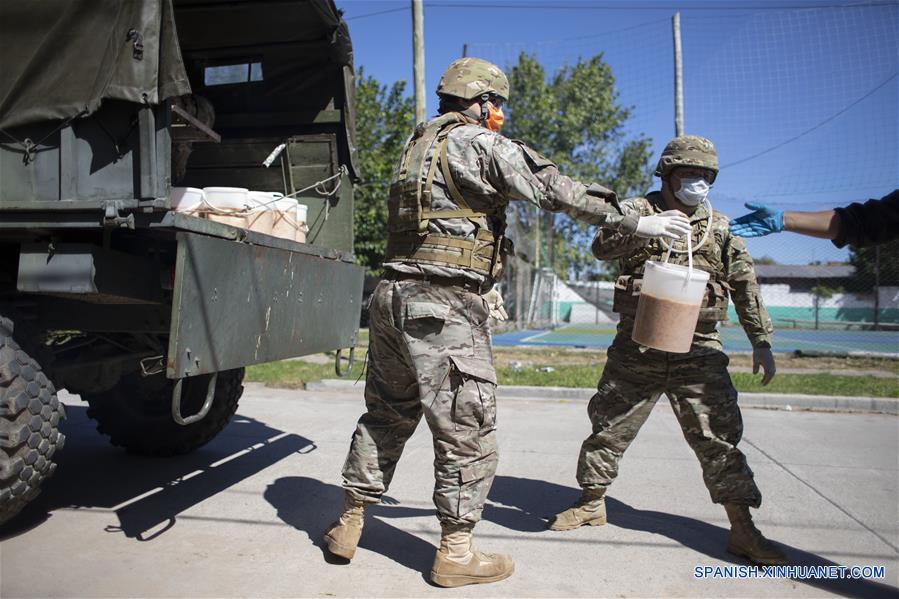 Elementos del Ejército argentino entregan raciones de comida en un comedor popular, en la localidad de Rafael Castillo, partido de La Matanza, a 35 kilómetros de la ciudad de Buenos Aires, capital de Argentina, el 2 de abril de 2020. Las Fuerzas Armadas de Argentina se han desplegado en puntos sensibles del territorio para apoyar en la batalla contra la enfermedad del nuevo coronavirus (COVID-19), cuyos casos confirmados suman hasta ahora 1.133 en todo el país.