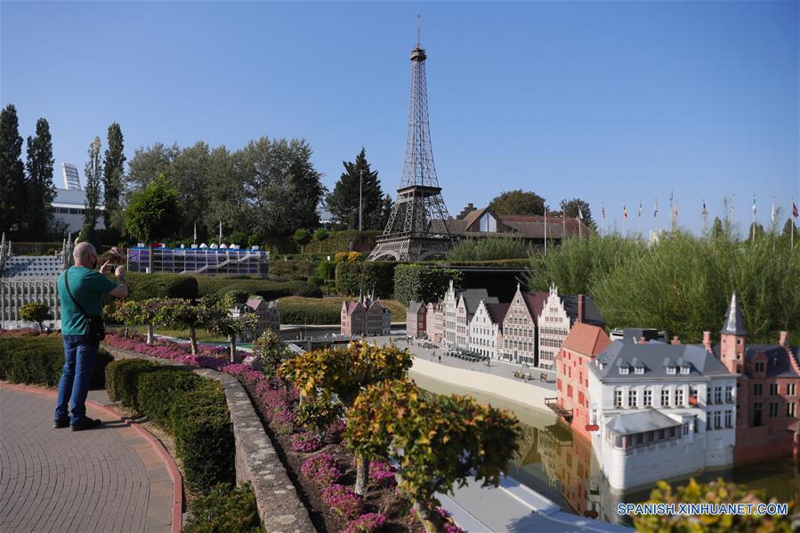 Imagen del 22 de septiembre de 2020 de un turista tomando fotografías en el parque Mini Europa, en Bruselas, Bélgica. El parque cuenta con muchas atracciones turísticas europeas en miniatura. Fue reabierto en mayo de 2020.