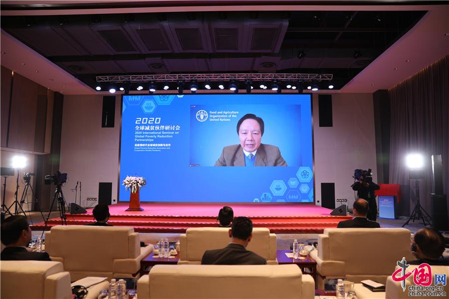 Se lleva a cabo el Seminario Internacional de Alianzas Globales para la Reducción de la Pobreza 2020 en la ciudad de Longnan, provincia de Gansu, el 24 de noviembre. En la imagen se retrata un discurso en video de Ye Anping, director del Departamento de la Cooperación Sur-Sur (CSS) y la Cooperación Triangular (CT) de la Organización de las Naciones Unidas para la Agricultura y la Alimentación (FAO).