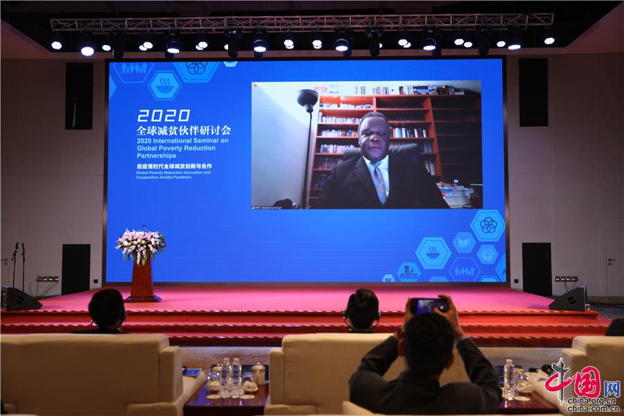 Se lleva a cabo el Seminario Internacional de Alianzas Globales para la Reducción de la Pobreza 2020 en la ciudad de Longnan, provincia de Gansu, el 24 de noviembre. La imagen muestra un discurso en video de Stanlake Samkange, director senior del Departamento de Relaciones Estratégicas del Programa Mundial de Alimentos (WFP).