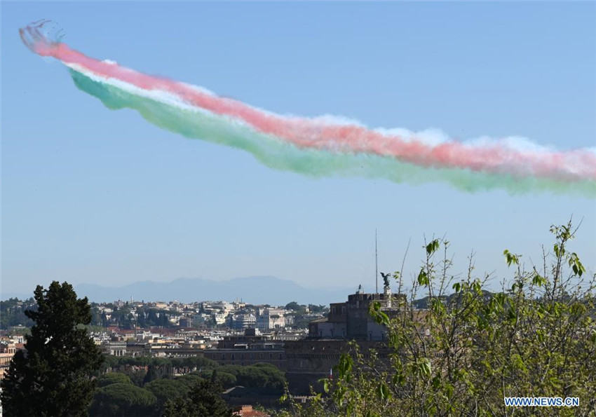 El escuadrón de acrobacia aérea italiano Frecce Tricolori realiza una presentación durante una ceremonia para conmemorar el Día de la Liberación de Italia, en Roma, Italia, el 25 de abril de 2021.