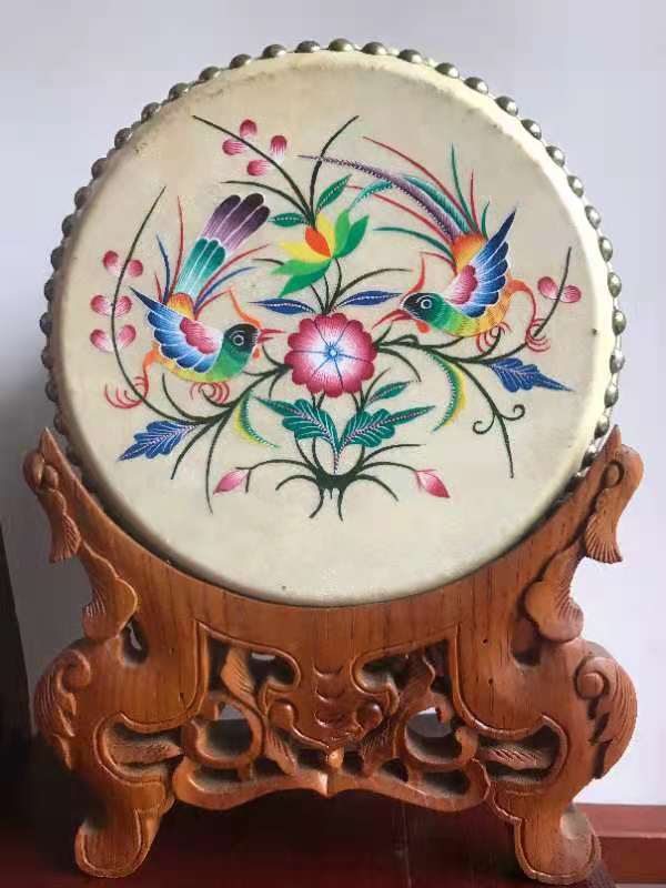 Un tambor con decoraciones artísticas de Liang Desong expone una pintura auspiciosa con estilo étnico distintivo de los Miao. Los bailes de tambor y la pintura de Miao son bastante representativos de la cultura Miao.