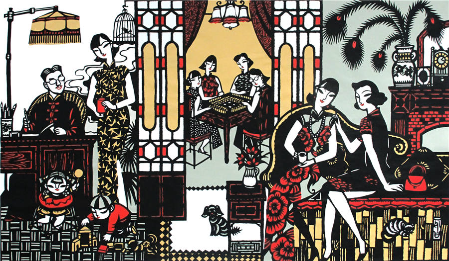 Un corte de papel titulado Shanghai Family creado por Li Shoubai retrata una vívida escena de la vida.