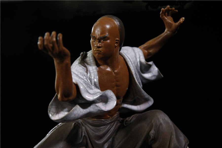 Una escultura de cerámica creada por el artista cerámico Pang Wenzhong representa el legendario maestro de Kung Fu Huang Feihong y retrata su impresionante postura de lucha.