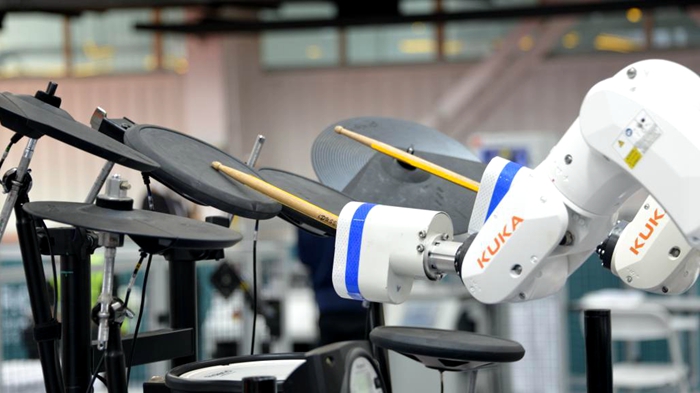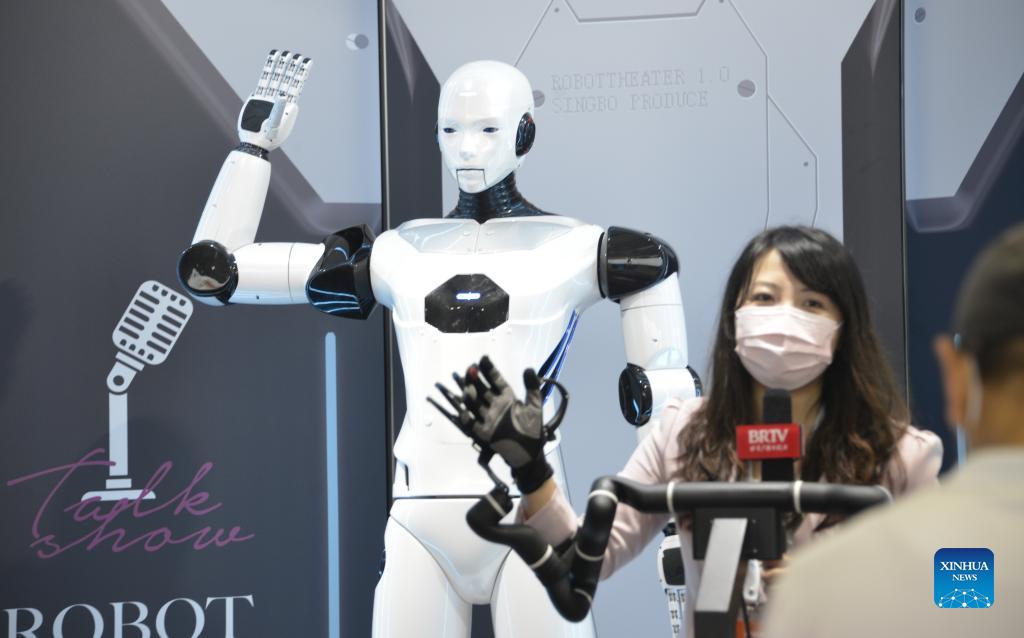 Una reportera interactúa con un actor robot inteligente en la Conferencia Mundial de Robótica celebrada en Beijing, capital de China, 12 de septiembre de 2021. La Conferencia Mundial de Robótica 2021 se llevó a cabo en Beijing del 10 al 13 de septiembre. Más de 110 empresas e instituciones de investigación científica trajeron más de 500 productos a la exposición.