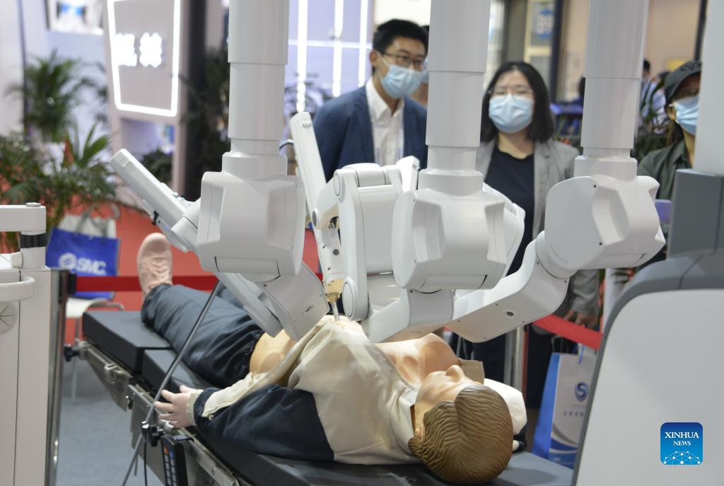 Fotografía del 12 de septiembre de 2021 de un robot quirúrgico en exhibición