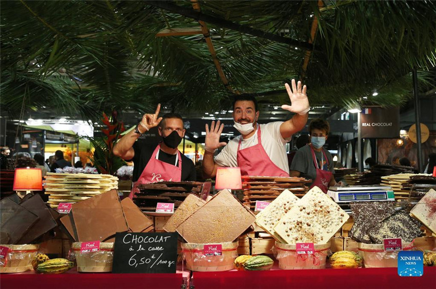 Miembros del personal saludan durante la noche de inauguración de la XXVI Feria del Chocolate de París en la Exposición de Versalles en París, Francia, 27 de octubre de 2021.