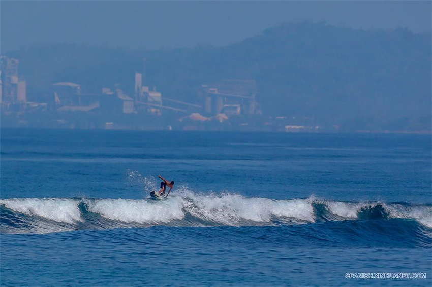 Un hombre surfea en el mar en una playa, en la provincia de La Unión, Filipinas, el 30 de octubre de 2021.