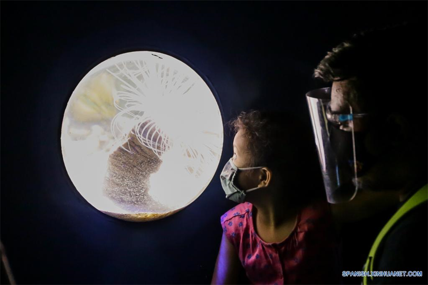 Un padre y su hija portan mascarillas mientras observan las atracciones submarinas en el Parque Oceánico de Manila en medio de la pandemia de la COVID-19, en Manila, Filipinas, el 6 de noviembre de 2021.