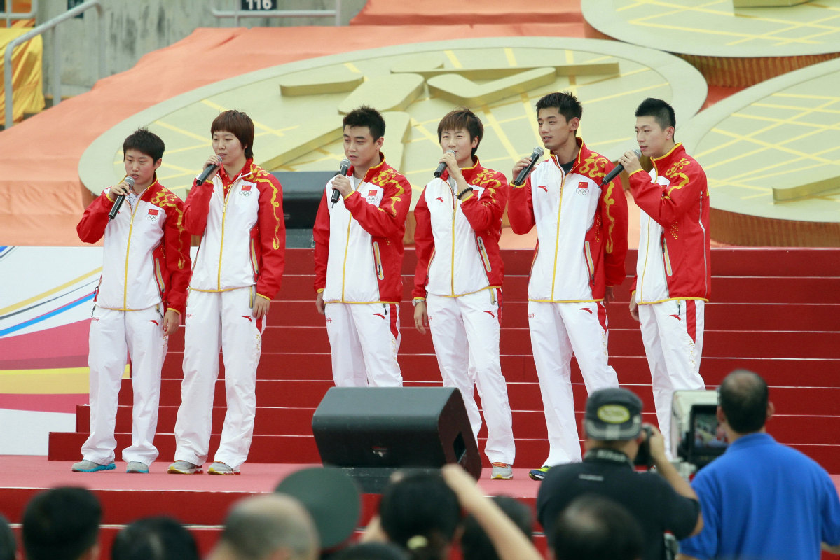 Miembros del equipo de tenis de mesa de la parte continental entonan una canción durante una visita a Hong Kong el 26 de agosto de 2012.