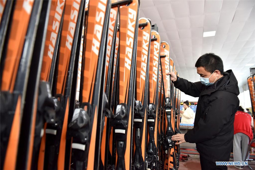 Imagen del 27 de enero de 2022 de Yang Xubo acomodando los esquís en una estación de esquí, en Xingtai, en la provincia de Hebei, en el norte de China. Yang Xubo es un entusiasta de los deportes de invierno en Xingtai. En 2018 comenzó un negocio de estación de esquí. Yang cree que su estación de esquí de 40.000 metros cuadrados ayudará a promover los deportes de invierno entre las personas.