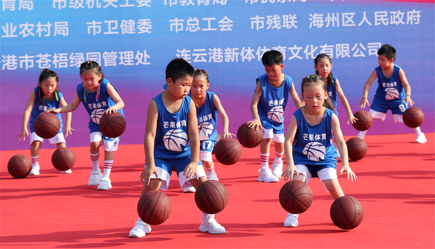 Niños botan pelotas de baloncesto en un escenario de Lianyungang, provincia de Jiangsu.
