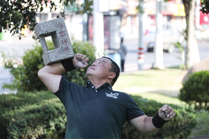 Un entusiasta del acondicionamiento físico levanta una candado de piedra en la Plaza del Gran Canal en Huai'an, provincia de Jiangsu, el 8 de agosto de 2022.