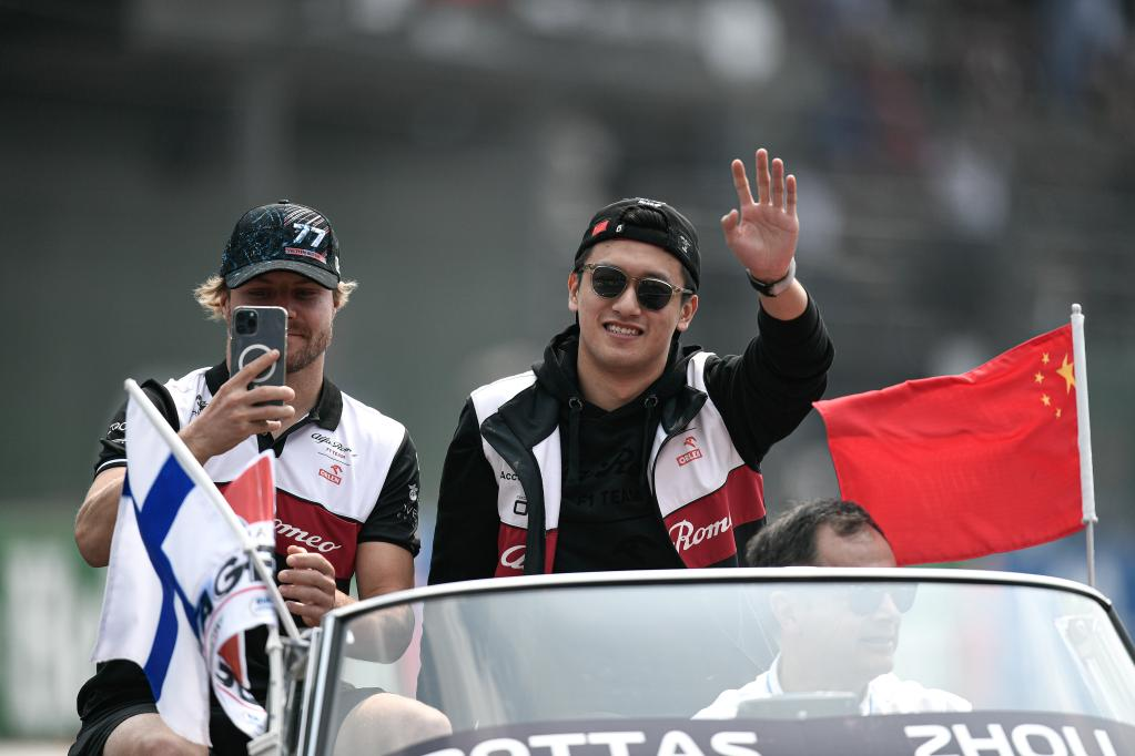 Imagen del 30 de octubre de 2022 del piloto chino de Fórmula 1 (F1), Zhou Guanyu (d), y el piloto finlandés de F1, Valtteri Bottas, de la escudería Alfa Romeo, participando en el desfile de pilotos previo al Gran Premio de México de F1 celebrado en el Autódromo Hermanos Rodríguez, en la Ciudad de México, capital de México. (Xinhua/Xin Yuewei)