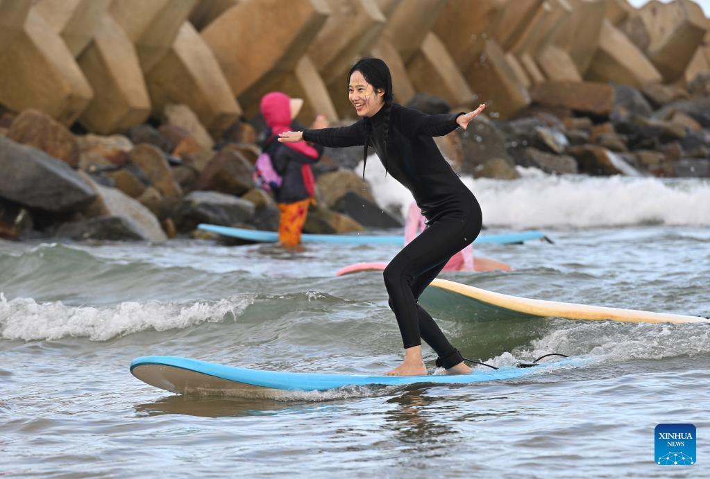 Imagen del 13 de enero de 2023 de una turista surfeando en la Bahía Riyue, en Wanning, en la provincia de Hainan, en el sur de China. El surf se ha convertido en un símbolo de Wanning gracias a sus singulares ventajas geográficas y climáticas. (Xinhua/Guo Cheng)