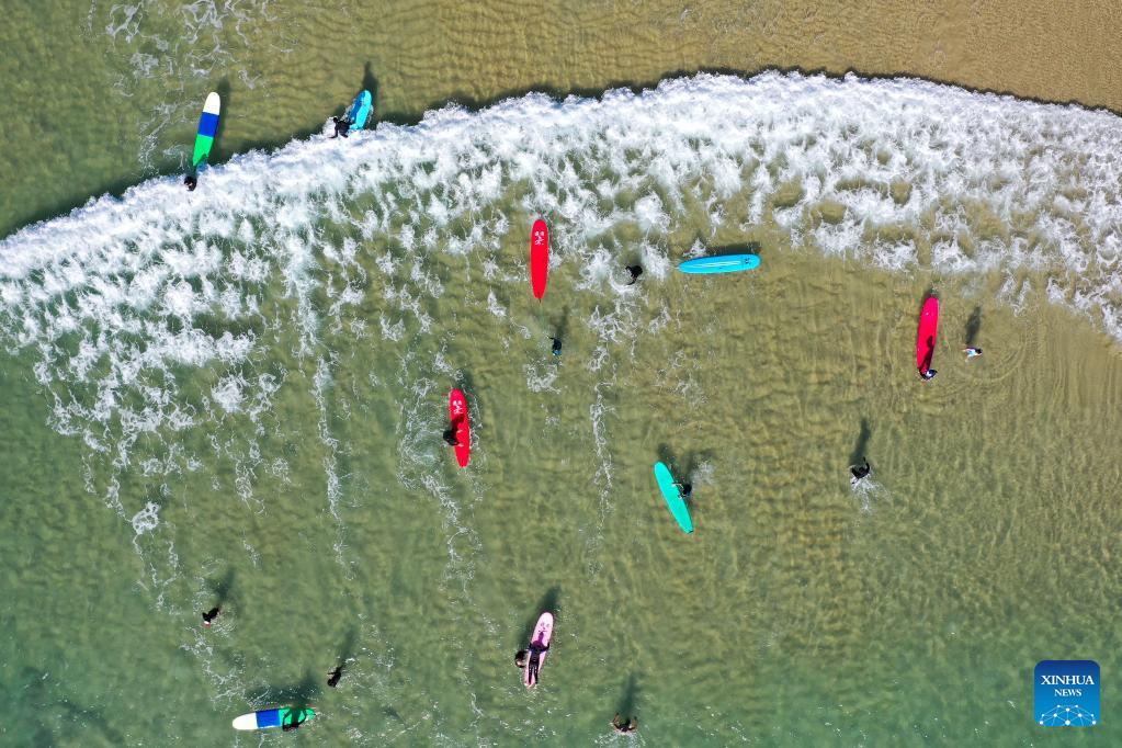 Vista aérea del 14 de enero de 2023 de turistas surfeando en la Bahía Riyue, en Wanning, en la provincia de Hainan, en el sur de China. El surf se ha convertido en un símbolo de Wanning gracias a sus singulares ventajas geográficas y climáticas. (Xinhua/Guo Cheng)