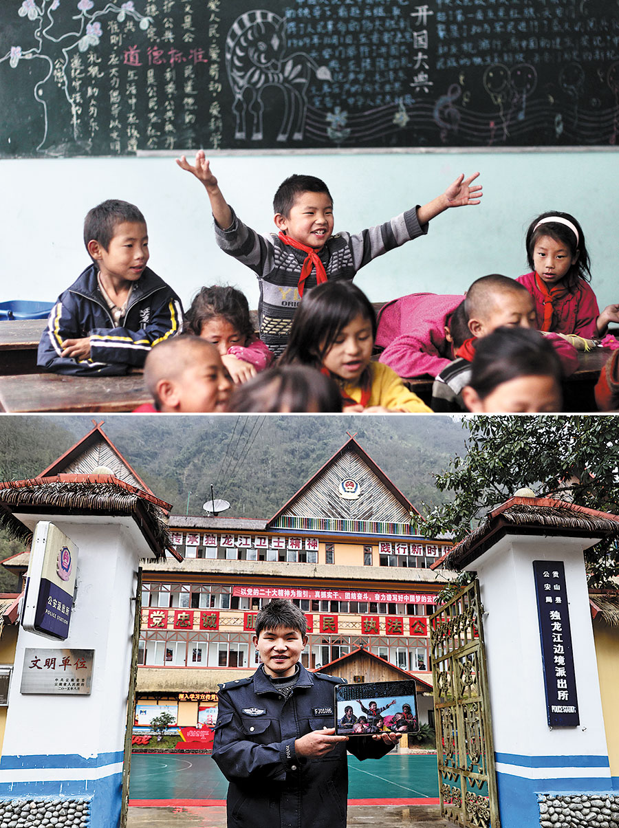 El estudiante de segundo grado Jin Xiaoping disfruta de un descanso entre clases el 20 de octubre de 2012; Jin, ahora auxiliar de policía en la comisaría de policía fronteriza en Dulongjiang, el 8 de febrero de este año. (Foto de Wang Jing/China Daily.)