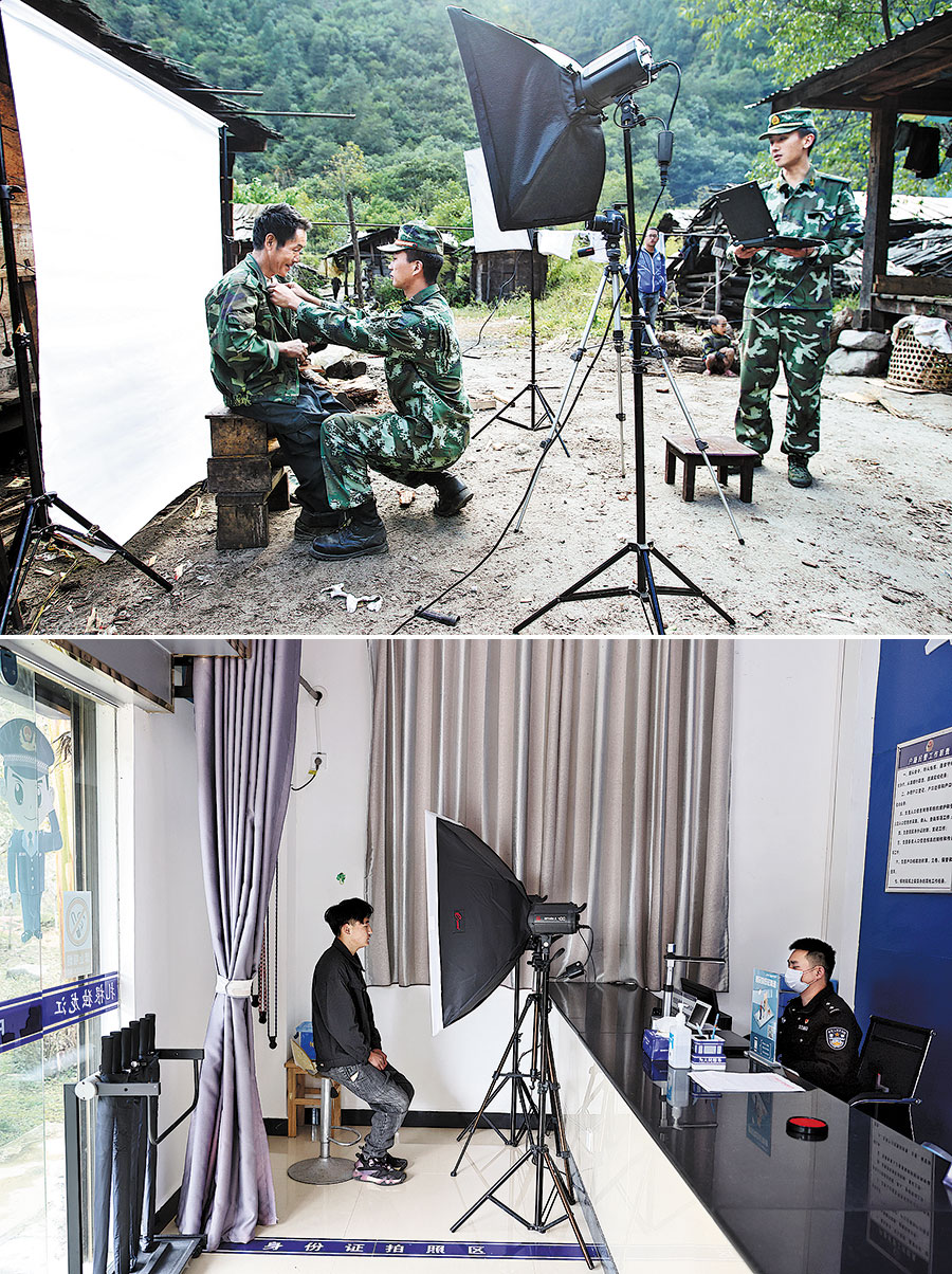 Oficiales de policía de la comisaría de policía transfronteriza local toman fotos de identificación para los aldeanos en la aldea de Xiongdang, el 21 de octubre de 2012. Llegaron al pueblo después de horas de caminar a caballo cargando todo el equipo de fotografía. En la foto de abajo, a un aldeano le toman una foto de identificación en la comisaría de policía del municipio el 6 de febrero de este año. (Foto de Wang Jing/China Daily.)