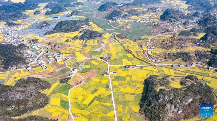 Esta foto aérea tomada el 9 de marzo de 2023 muestra campos de flores de cole en la aldea Wayao de la ciudad de Mugang, distrito especial de Liuzhi, Liupanshui, provincia de Guizhou, suroeste de China.