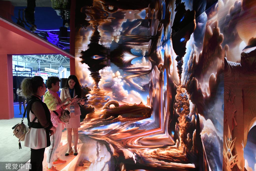 Los visitantes experimentan una interpretación interactiva inmersiva en la exposición de la industria cultural en Guangzhou, provincia de Guangdong, el 9 de marzo de 2023. [Foto/VCG]
