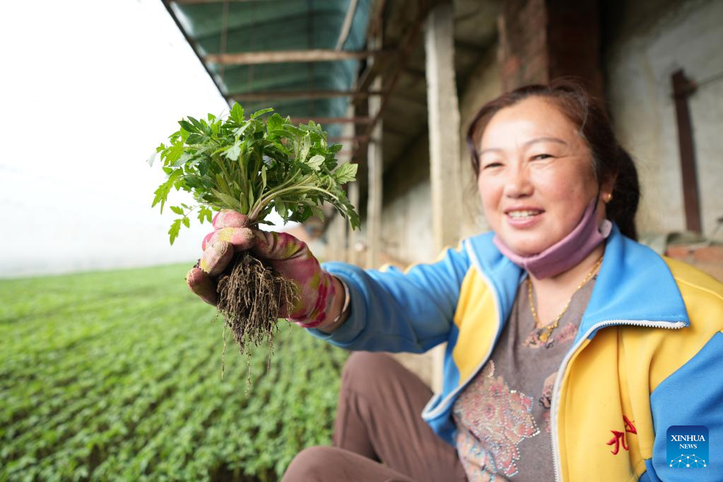 Una aldeana sostiene plántulas de tomate en su mano en un invernadero en la aldea Wanxing del municipio de Changqing, Jiamusi, provincia de Heilongjiang, en el noreste de China, el 9 de marzo de 2023. En la provincia de Heilongjiang, aunque la temperatura aún es baja a principios de la primavera, los aldeanos están aprovechando los invernaderos para impulsar la eficiencia de la producción agrícola y aumentar sus ingresos. (Xinhua/Wang Jianwei)