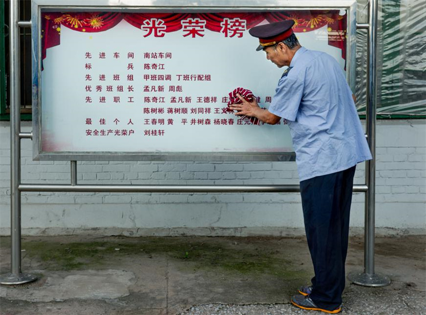 Liu Tongxiang fue un empleado de la Estación Sur de Tanggu durante 40 años. Aquí aparece limpiando un cartel en honor a los trabajadores extraordinarios de la estación.