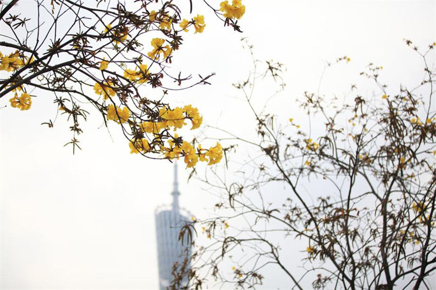 Árboles florecientes — Tabebuia chrysantha, Bauhinia variegata y kapok — en plena floración en Guangzhou, provincia de Guangdong, recientemente.
